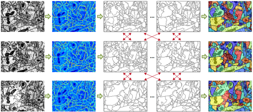 Automated segmentation is done by a machine learning algorithm, which a neurobiologist trains by marking the cell boundaries in as few as five images. The algorithm then learns the features—edges, corners, textures, etc.—associated with cell boundaries. Occasional errors can be corrected on the go, and the algorithm learns from these errors. With all the cell boundaries in a stack of images identified, a second machine learning method combines information from the images to reconstruct the shape of a neuron in three-dimensional space.