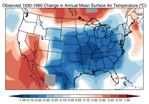 Observed change in surface air temperature between 1930 and 1990. Observations are from the NASA GISS Surface Temperature Analysis. Image courtesy of Eric Leibensperger.
