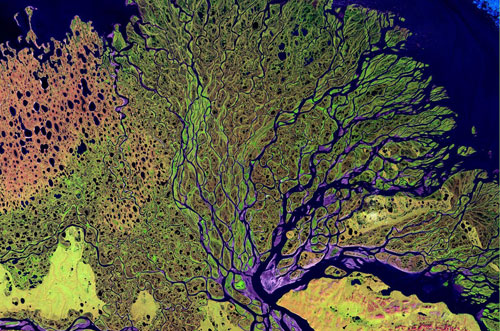 The Lena River delta. The Lena is one of several major rivers that flows northward into the Arctic Ocean. (False-color satellite image courtesy of NASA.)