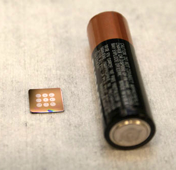 Each dark speck within the nine white circles at left is a tiny fuel cell. An AA battery is shown for size comparison. (Photo by Caroline Perry, SEAS Communications.)