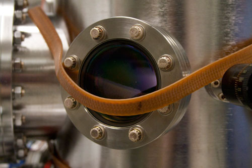 Purple plasma is visible through the window of this vacuum deposition chamber. The equipment is used for creating the extremely thin-layered electrodes and electrolyte on a wafer of silicon. (Photo by Caroline Perry, SEAS Communications.)