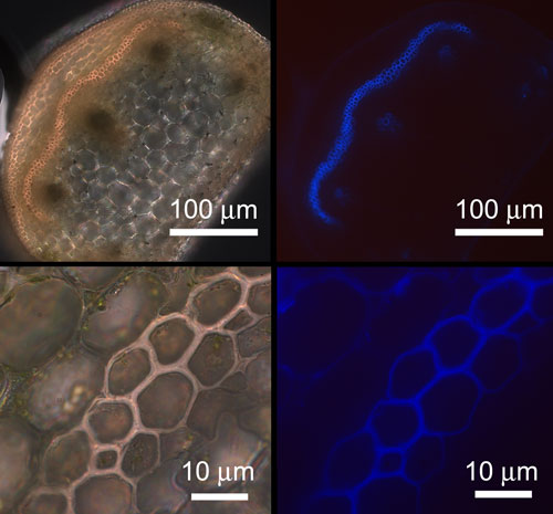 The lignified cells in the tendril's fiber ribbon glow bright blue under ultraviolet light. The thickened cell walls are clearly visible in the bottom two images. (Photos courtesy of Joshua Puzey and Sharon Gerbode.)