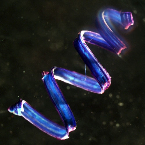 Gerbode and her coauthor Joshua Puzey (Ph.D. '12), who was studying organismic and evolutionary biology in the Graduate School of Arts and Sciences (GSAS) at the time, tried to reconstruct this fiber ribbon with a silicone model. They stretched a sheet of elastic silicone, secured the ends, and then spread a thin layer of silicone caulk across its surface. When the caulk cured, they cut a thin strip off the model, held both ends, and watched it coil into a pair of perfect helices. When they pulled on both ends, however, it simply unraveled and lay flat, adding no extra coils as they had hoped.