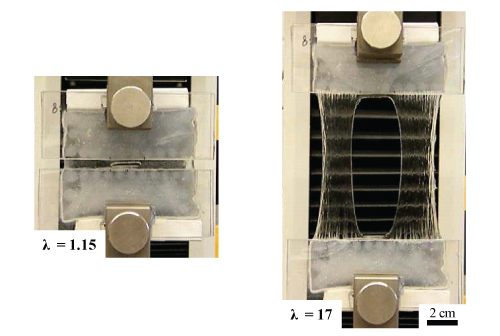 The researchers pinned both ends of the new gel in clamps and stretched it to 21 times its initial length before it broke. (Photo courtesy of Jeong-Yun Sun.)