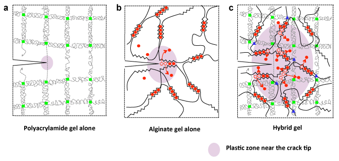Therefore, if the gel acquires a tiny crack as it stretches, the polyacrylamide grid helps to spread the pulling force over a large area, tugging on the alginate's ionic bonds and unzipping them here and there. The research team showed that even with a huge crack, a critically large hole, the hybrid gel can still stretch to 17 times its initial length.