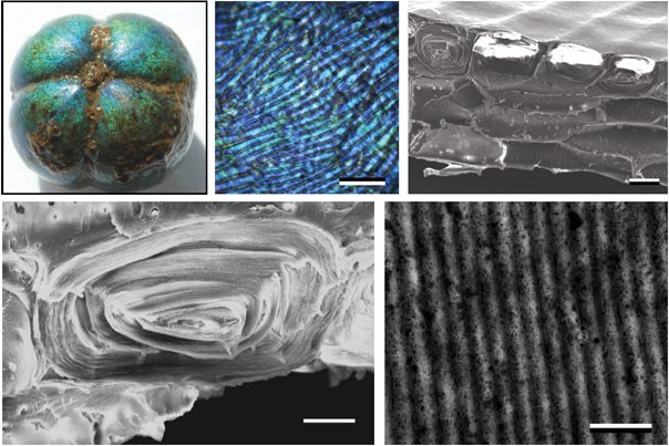 Vukusic and his collaborators at Harvard studied the structural origin of the seed’s vibrant color. They discovered that the upper cells in the seed’s skin contain a curved, repeating pattern, which creates color through the interference of light waves. (A similar mechanism is responsible for the bright colors of soap bubbles.) The team’s analysis revealed that multiple layers of cells in the seed coat are each made up of a cylindrically layered architecture with high regularity on the nano- scale.