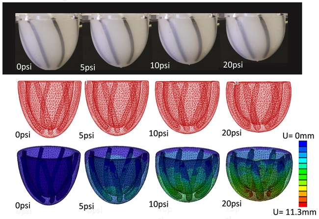 To achieve the heart’s 3D motion, the team embedded their soft modified PAMs—made of silicone elastomer in a braided mesh—in a matrix also made of soft silicone elastomer. The top images show the team’s heart prototype as it is subjected to various pressures. The middle images show a computer model of the mesh only as it deforms at corresponding pressures, and the third row is a computer model showing how the heart changes its motion in response to the different pressure regimes. U indicates displacement.