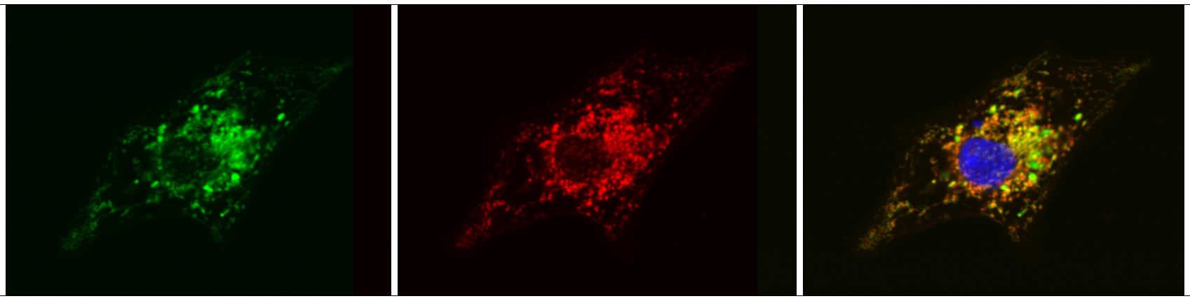 This series of images shows how inserting modified RNA into diseased cells causes the cells to produce functioning versions of the TAZ protein (from left, green), which correctly localize in the mitochondria (red). When the images are merged to demonstrate this localization, green overlaps with red, giving the third image a yellow color around its edges. (Image courtesy of Gang Wang and William Pu, Children’s Hospital Boston.)