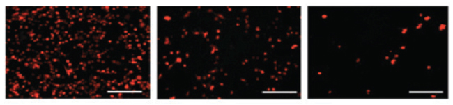 Fluorescence micrographs show red-colored breast cancer cells that were exposed to three different treatments. The use of ultrasound to trigger periodic bursts of higher drug doses (right) was most effective in killing the cancer cells. (Image credit: Wyss Institute and Harvard SEAS.)