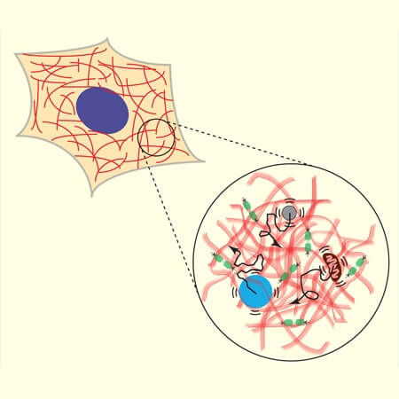 Within the cytoplasm, fluctuating forces enhance the intracellular transport of proteins and organelles. (Image courtesy of Ming Guo, Harvard SEAS.)