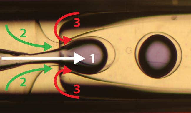 This image shows the flow-focusing microfluidic capillary device used to produce the silicone microcapsules, where fluids 1, 2 and 3 correspond to the carbonate solution, ultraviolet-curable silicone, and an outer aqueous solution, respectively. (Image courtesy of John Vericella, Chris Spadaccini, and Roger Aines, LLNL; James Hardin and Jennifer Lewis, Harvard University; and Nature.)