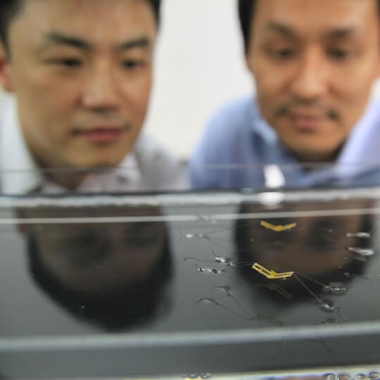 From left, Seoul National University (SNU) professors Ho-Young Kim, Ph.D., and Kyu Jin Cho, Ph.D., observe the semi-aquatic jumping robotic insects developed by an SNU and Harvard team. (Photo by Seoul National University)