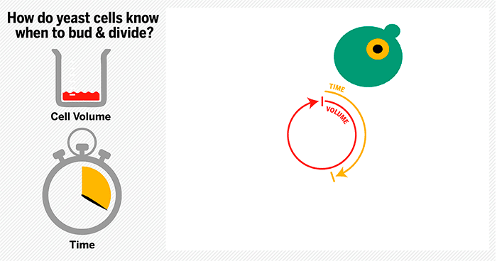 The cycle begins at budding. When a mother cell buds, two gauges begin ticking in the daughter cell, one measuring time, the other volume added. Each gauge has a pre-programmed stopping point. When the timer runs out, the daughter cell knows its time to divide. When the right amount of volume is added, the daughter knows its time to bud. Every cell, regardless of its size at birth, adds the same amount of volume before budding and grows the same amount of time before division.