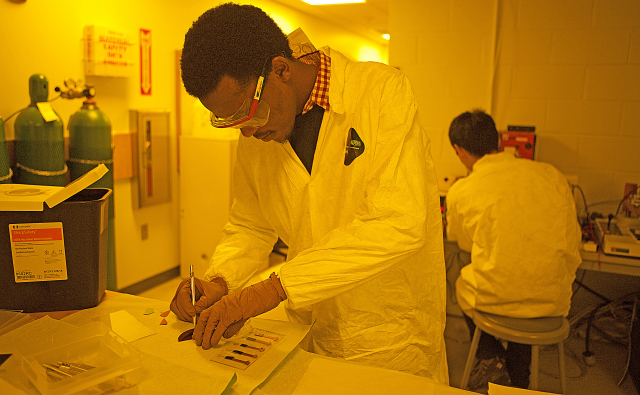 Samwell Emmanuel, S.B. ’17, carefully works with a thin piece of material in the SEAS teaching clean room. (Photo by Adam Zewe/SEAS Communications.)