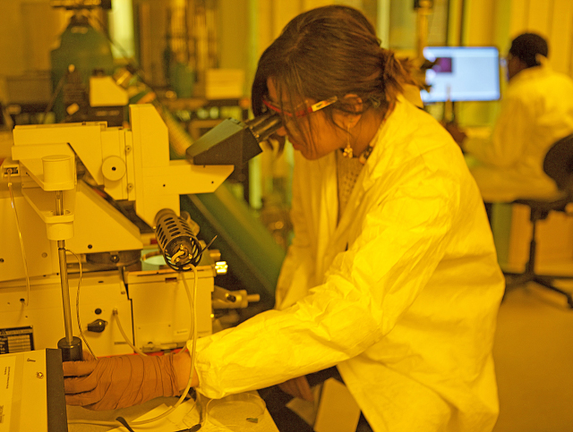 That’s huge compared to the device components students build in the Microfabrication Laboratory course at the Harvard John A. Paulson School of Engineering and Applied Sciences (SEAS).Under the instruction of Evelyn Hu, Tarr-Coyne Professor of Applied Physics and of Electrical Engineering, and Peter Stark, Visiting Associate Professor in Engineering Sciences, students are learning the “tricks of the trade” that could enable them to eventually form structures 1,000 times smaller than a strand of hair.