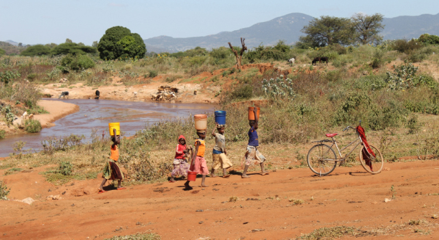 A group of young children in Mkutani carry water back to their homes. (Photo by Peter Jin.)