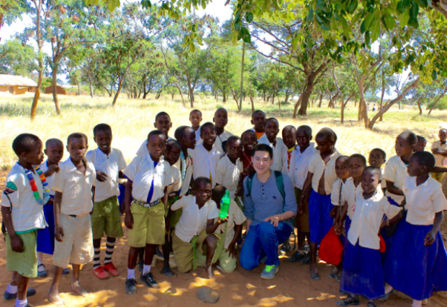 Harvard College Engineers Without Borders President Peter Jin with Mkutani elementary school students. (Photo provided by Peter Jin.)