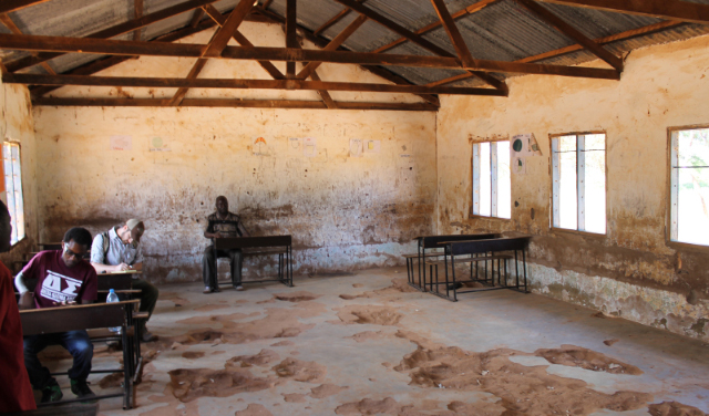 The cracked floors and crumbling walls of the Mkutani elementary classrooms make the space difficult for students to use. (Photo by Peter Jin.)