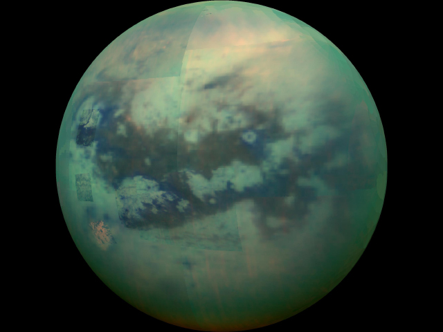 This composite image shows an infrared view of Saturn's moon Titan from NASA's Cassini spacecraft, acquired during the mission's "T-114" flyby on Nov. 13, 2015. Photo courtesy of NASA/JPL/University of Arizona/University of Idaho.