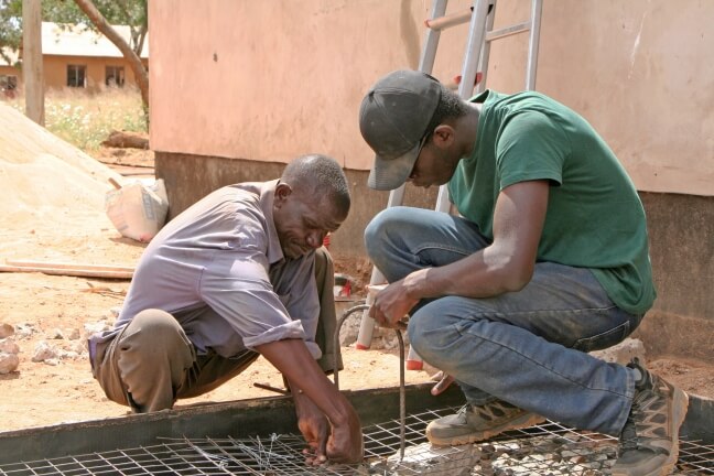 Avery Meyer, Alfred Kwayemba, and Daniel Getega, S.B. ’19, install wire mesh that will serve as internal stability for the concrete slab at the New Schoolhouse.