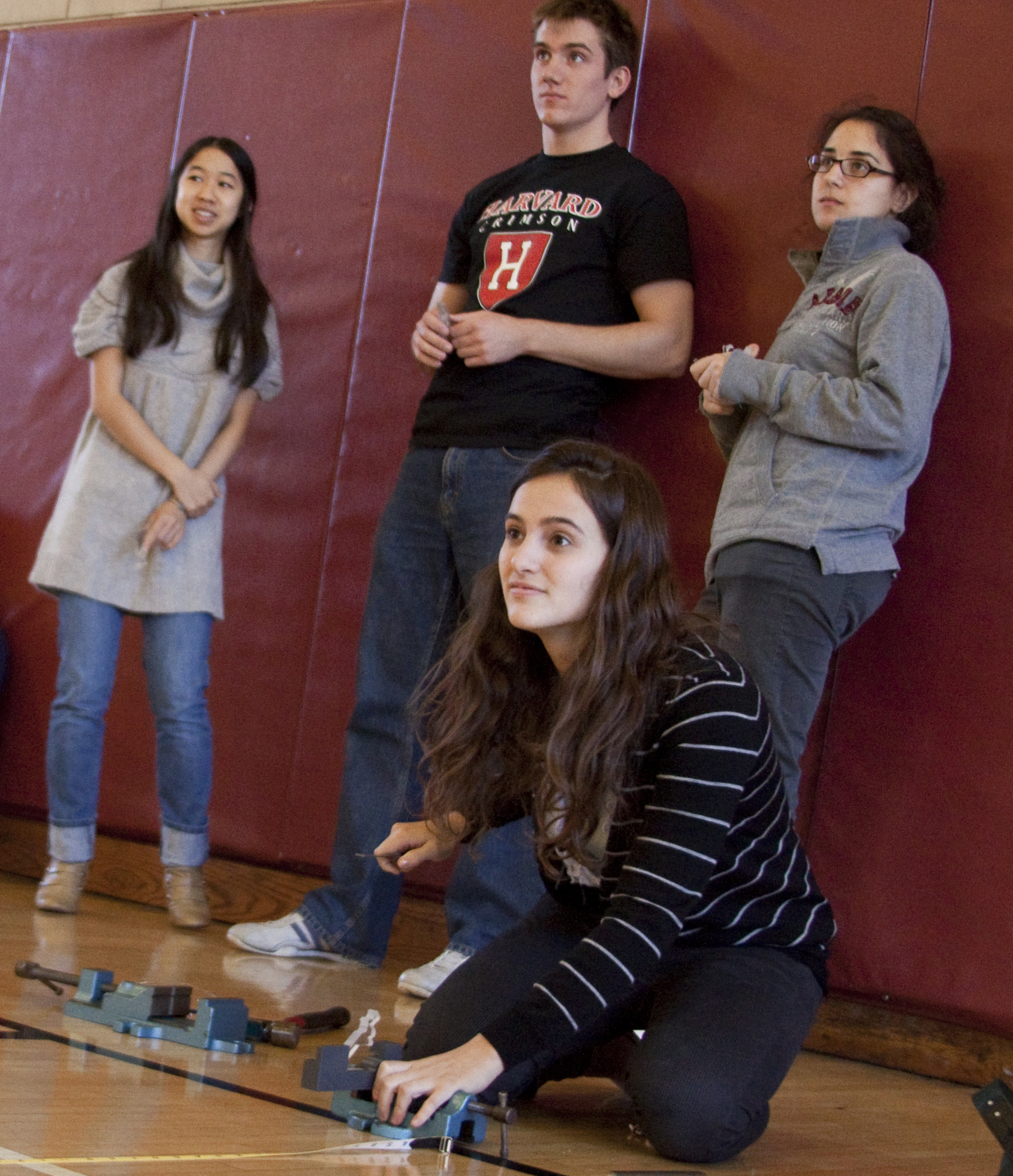 Amelia Lin '11, Daniel Bruder '12, Laura Freeman '12, and Juliana Cherston '13 (in front) look skyward as a Tootsie Roll rockets across the Hemenway Gym. Sending a sweet treat to new heights by means of a clever catapult is just one of the ways Harvard engineering students gain design experience.
