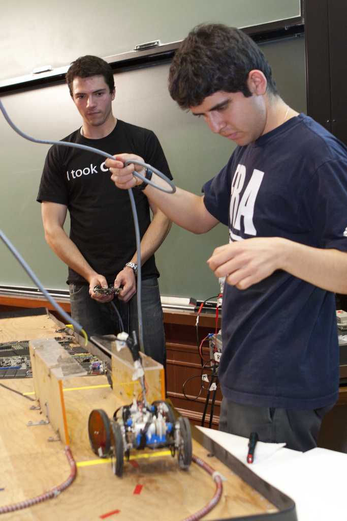 "The goal is to teach them the basics of design," said Neil Tenenholtz, a second-year graduate student and teaching fellow for the course, who was helping students assemble chassis and controllers in the lab. "Until this point in the class, we'd give them a design and say, 'Go make this.' Now we'll see if they can put the two parts together."