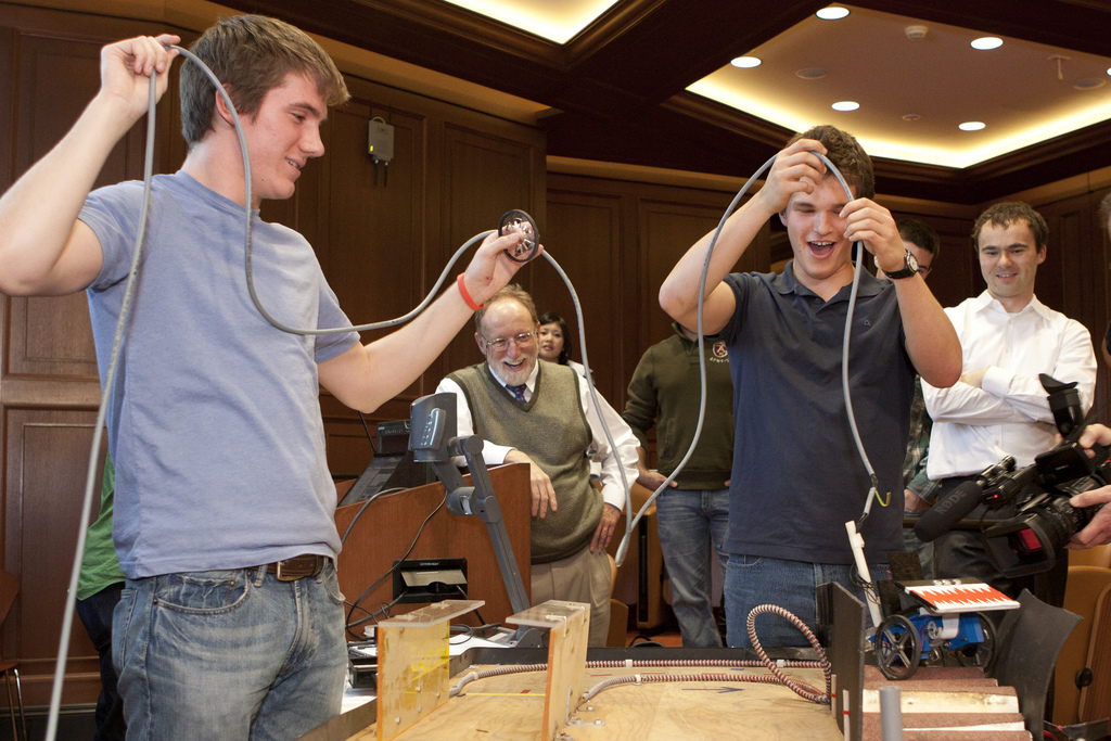 Down one wheel but still going strong, Team Nemo completed a U-turn and prepared to tackle the mountainous pipes. Dan Bruder '12 (left) and Michael Lukas '14 (second from right) held the control cable while visiting lecturers Barry Griffin '71 and Conor Walsh looked on.