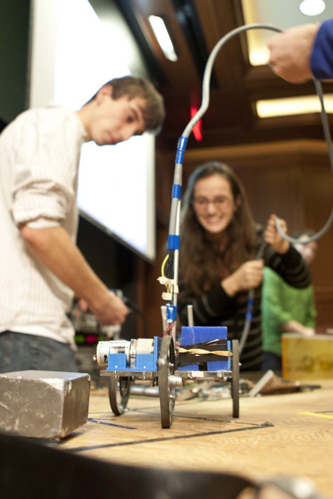 Damien Pietrus '14 drove his team's car toward the circuit board rubble, while Juliana Cherston '13 held the control cable out of its path.
