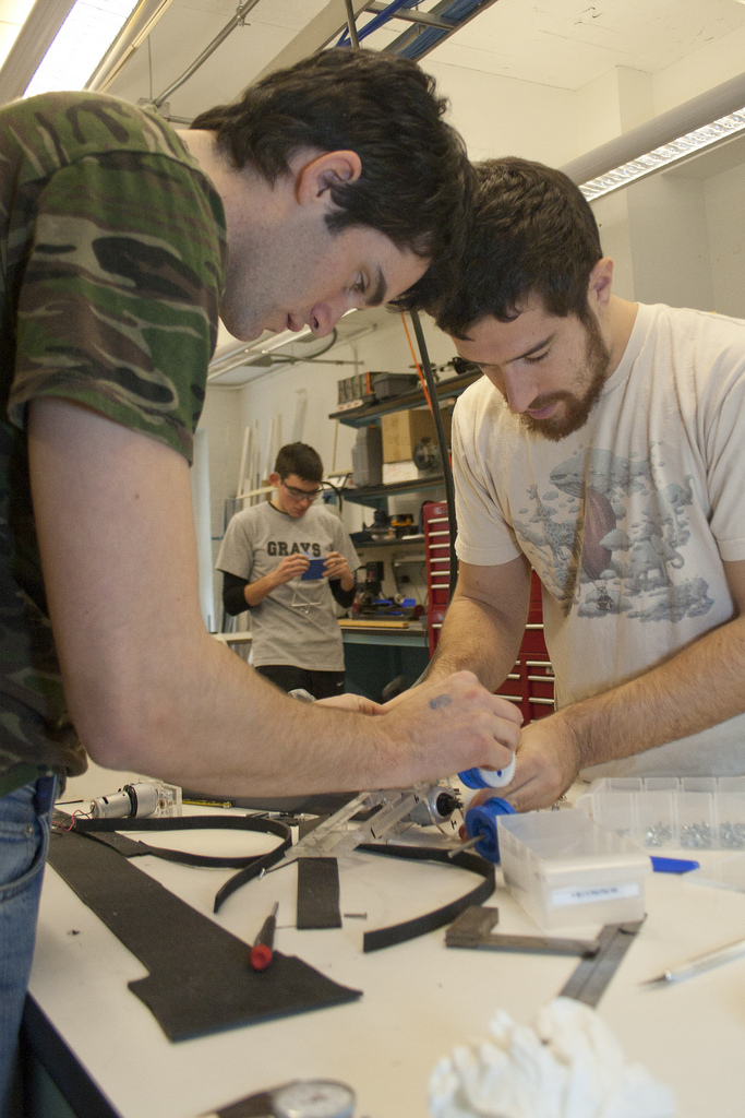 Colin Saintangelo '11 (left) and Sam Wald '11 (right) assembled their tank threads, while Barry McKenna '14 (center) perfected his chassis.