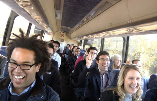 Undergraduate and graduate students from six schools at Harvard rode a bus to Facebook's headquarters in Palo Alto. Photo courtesy of Matt Weber, Harvard Graduate School of Education.