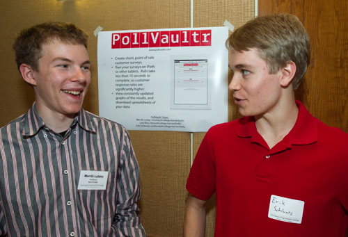 Merrill Lutsky '15 and Erik Schluntz '15 represented PollVaultr at the I3 finale. Photo by Jon Chase, Harvard News Office.