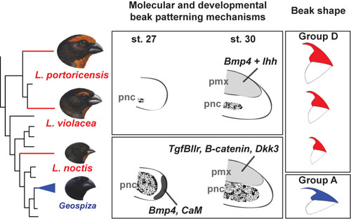 A comparison of beak developmental programs and eventual beak shapes reveals a high degree of flexibility in their relationship. Darwin's finches (Geospiza, bottom left) and the Lesser Antillean Bullfinch ("small bullfinch") employ similar cell populations and genes to establish very distinct beak shapes, while the larger species of Caribbean bullfinches use a novel combination of two signaling molecules to build a beak identical in shape to the smaller bullfinch. (Image courtesy of Ricardo Mallarino.)