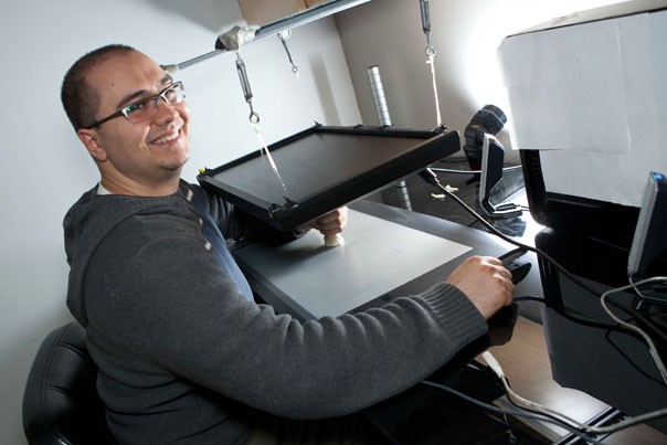 The answer lies in a simple room slightly bigger than a walk-in closet. Near the entrance to Smith’s lab, an alcove space is outfitted with a table, a monitor, an adjustable barber chair, and a digital pen and pad. The simple setup allows Smith and his team to record movements and to train participants to make hand motions based on visual cues.