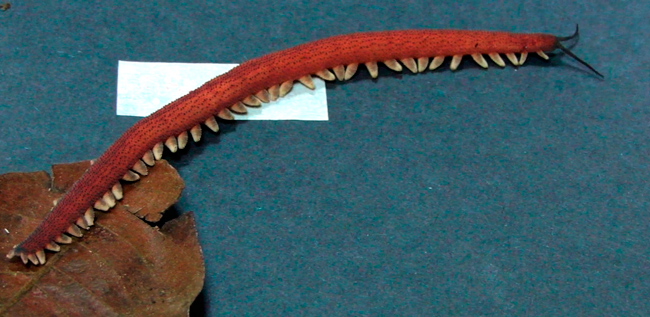 The velvet worm has an unusual defense and predation mechanism. Shown here is the gigantic Solorzanoi; the masking tape in the background measures two inches. (Image courtesy of Cristiano Sampaio-Costa and Andrés Concha.)