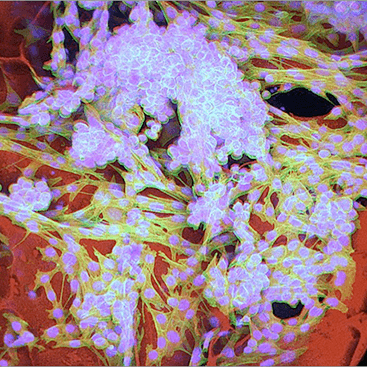 Cancerous melanoma cells shown with their cell bodies (green) and nuclei (blue) are nestled in tiny hollow lumens within the polymeric cryogel (red) structure. Credits: Thomas Ferrante, Sidi A. Bencherif / Wyss Institute at Harvard University