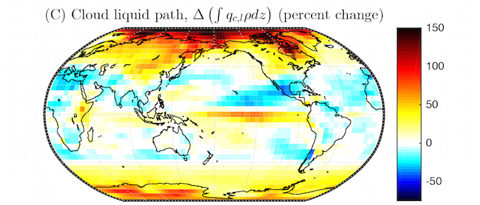 The percent changes in the vertical integral of cloud liquid, which more than doubles over some high-latitude regions between the historical period of 1980-1999 to future projections from 2080-2099.