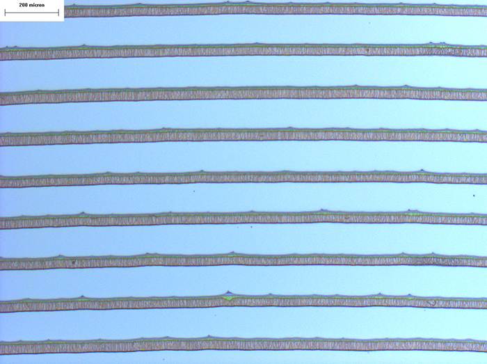 Periodic bands of colloidal deposits on a silicon substrate placed vertically. (Photo courtesy of the Aizenberg Lab, SEAS)