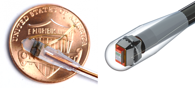 Image of the sensor encapsulated into the catheter with a US penny for scale, and (right) a photorealistic rendering of the molded system.
