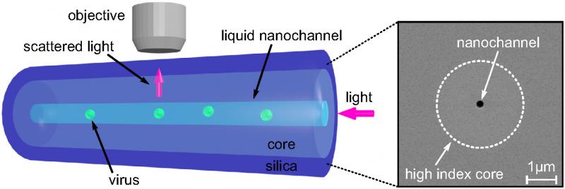 To solve these problems, the team decided to leverage the outstanding quality of optical fibers, perfected over years of research in the telecommunication industry. They designed a new optical fiber with a nano-scale channel, smaller than the wavelength of light, running along the inside of its silica core. This channel is filled with liquid containing nanoparticles, so that when light is guided through the fiber’s core, it scatters off the nanoparticles in the channel and is collected by a microscope above the fiber.