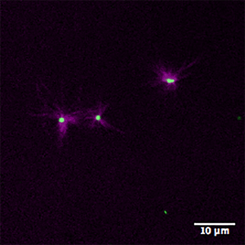 Asters form as motor protein draws the minus ends of the purple microtubules together (Image Needleman Lab/Harvard SEAS)