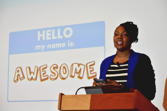 Cathyrn Posey, director of strategic partnerships and alliances for the White House United States Digital Service, speaks during the WECode conference. (Photo courtesy of Harvard Women in Computer Science.)