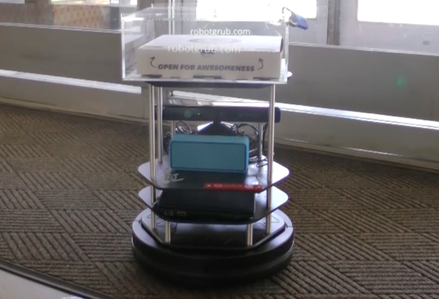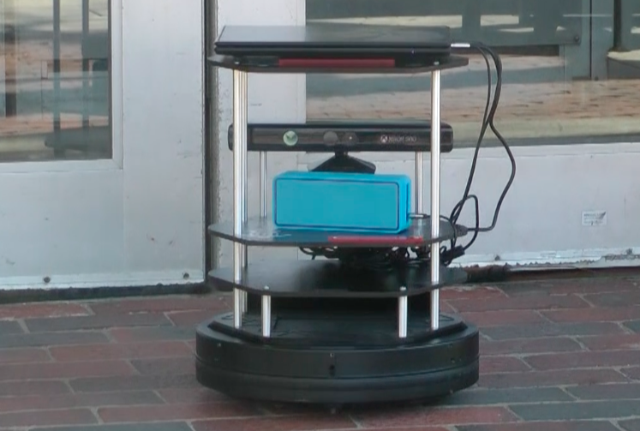 The cookie delivery robot successfully gained entrance into the residence hall. (Image courtesy of Serena Booth.)
