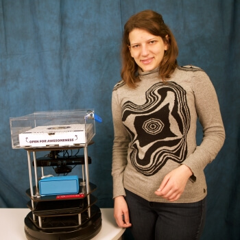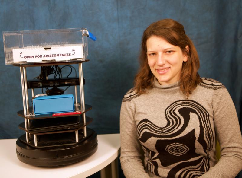 Serena Booth, A.B. '16, a computer science concentrator, with the robot, Gaia, which she used to examine the concept of over-trusting robotic systems. (Photo by Adam Zewe/SEAS Communications.)