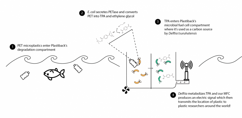 Plastiback is a floating ocean bioreactor containing genetically modified E. coli bacteria, which is used to identify and degrade a type of micro-plastic called polyethylene terephthalate (PET). PET is commonly used in many products that end up as ocean pollution, from disposable water bottles to commercial fishing equipment. The students genetically engineered these E. coli to secrete an enzyme that breaks down PET into terephthalic acid and ethylene glycol. A fluorescent protein glows green when the PET-degrading enzyme is expressed, so researchers who use the device can easily see whether the system is working correctly.