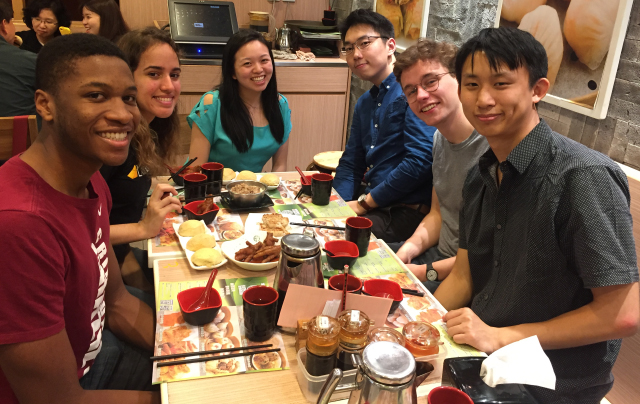 Students (from left) Milan Ravenell, Natalia Pachero-Tallaj, Lily Zhang, Clarence Hou, Carl Denton, and Sam Liu having dinner at a Hong Kong restaurant. (Photo provided by Sam Liu.)
