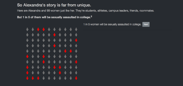 They compiled information from national datasets and university reports to develop interactive visualizations. One graphic uses color-changing icons to highlight the percentage of undergraduate women who will be sexually assaulted (20 percent), the ratio of victims who know their assailant (90 percent), and the percentage of victims who don’t report their assault (95 percent).