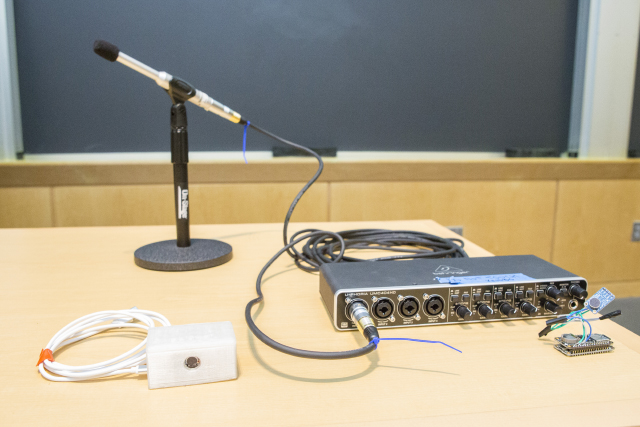 The students utilized WIFI-enabled audio recording hardware to gather data they used to develop a model to quantify speech intelligibility in classrooms. (Photo by Eliza Grinnell/SEAS Communications.)