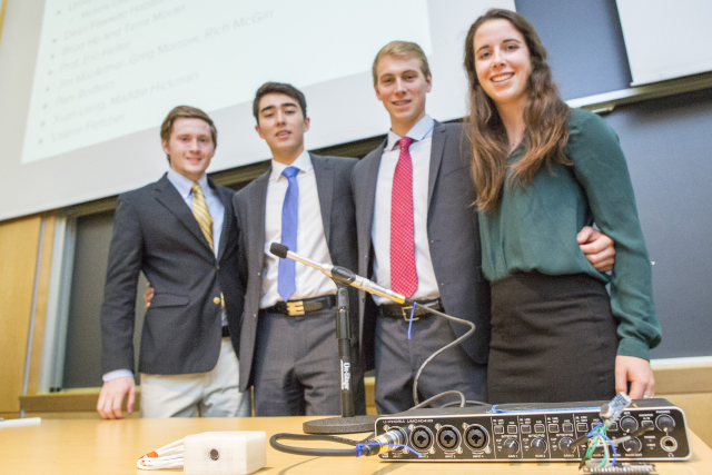 For SweetSpot, the students studied acoustics in certain classrooms and common spaces by installing wifi-enabled microphones that broadcast real-time sound data to a website. The application calculates average sound intensity over time and incorporates that data into a user-friendly interface to provide room suggestions based on user inputs of preferred days, times, and noise levels.
