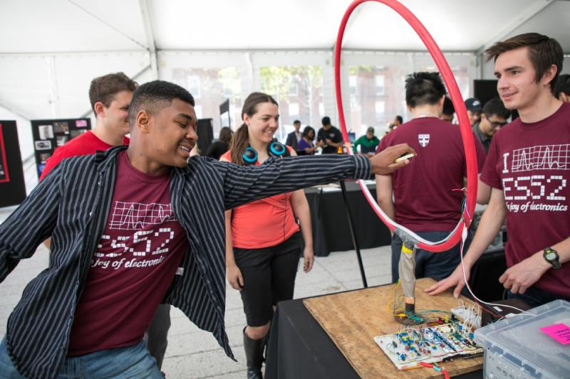 The project, which the team developed for The Joy of Electronics (ES 52), was one of about 75 featured projects under the Science Center Plaza tent at the annual SEAS showcase of student design and engineering acumen.