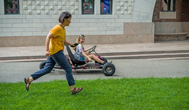 Team Cardi driver Ashlyn Frahm, S.B. ’19, an electrical engineering concentrator, tries to outrace Evelyn Hu, Tarr-Coyne Professor of Applied Physics and Electrical Engineering. (Photo by Li Chen.)